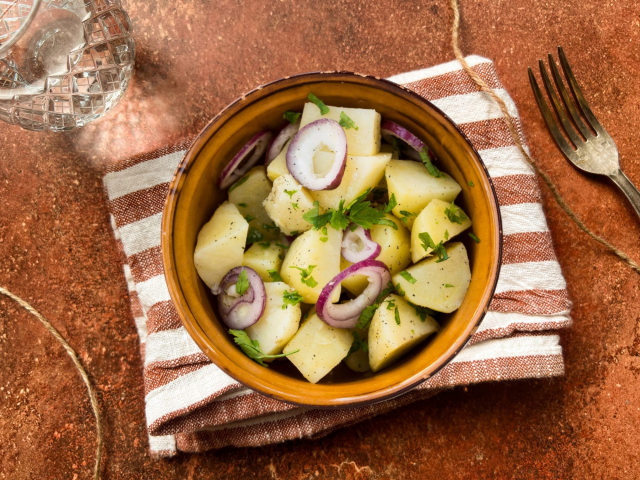 Pomme de terre, oignon rouge, ciboulette, persil, cornichon, moutarde, huile de tournesol, vinaigre de vin, poivre, sel Moutarde, sulfites, traces possibles d'oeuf et fruits à coque
