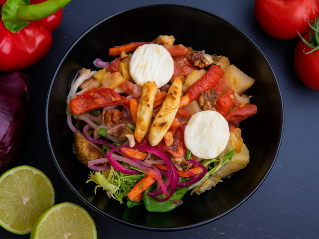 Poulet, fromage de chèvre, boulgour, courgette, carotte, tomate, oignon, ail, salade verte, menthe, persil, thym, citron, huile d'olive, vinaigre de cidre, cumin, poivre, sel