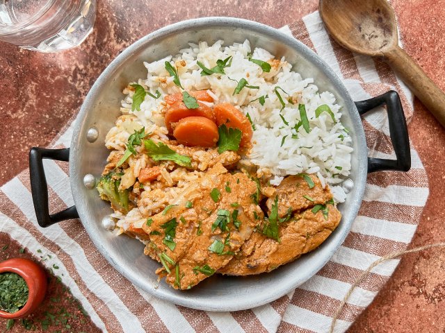 Chou blanc, riz basmati, navet, carotte, poivron, tomate, oignon, ail, gingembre, cébette, ciboulette, laurier, pâte d'arachide, concentré de tomates, huile de tournesol, poivre, sel Arachide, fruit à coque, traces possibles d'oeuf