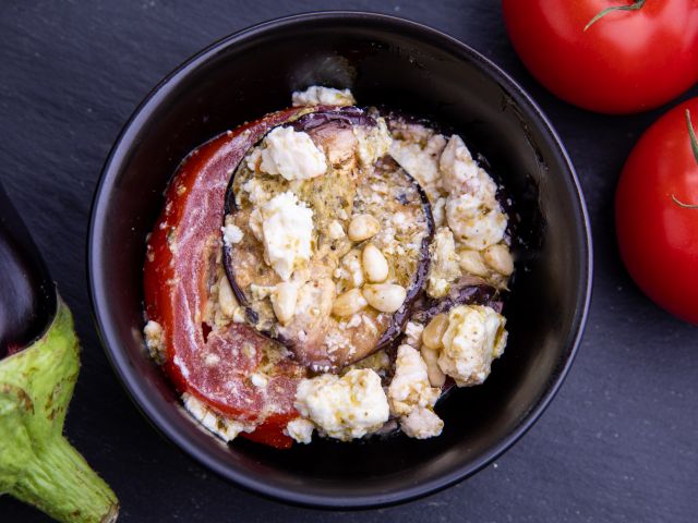Aubergine, tomate, ail, basilic, féta (lactose), parmesan, pignon de pin (fruit à coque), citron confit, huile d'olive, vinaigre de xérès, poivre, sel, traces possibles d'oeuf