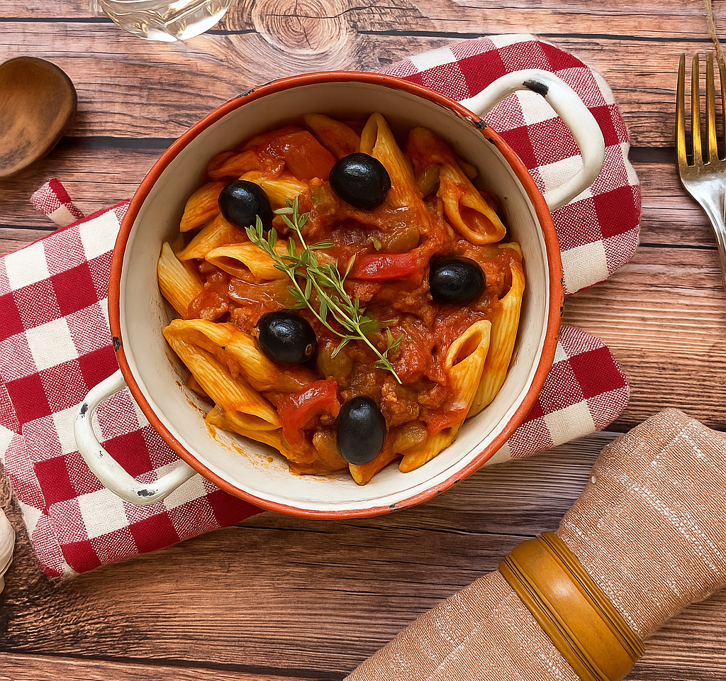 Spaghetti, tomate, carotte, persil, oignon, ail, olive noire, câpre, huile d'olive, piment doux, poivre, sel Gluten, oeuf, traces possibles de fruits à coque