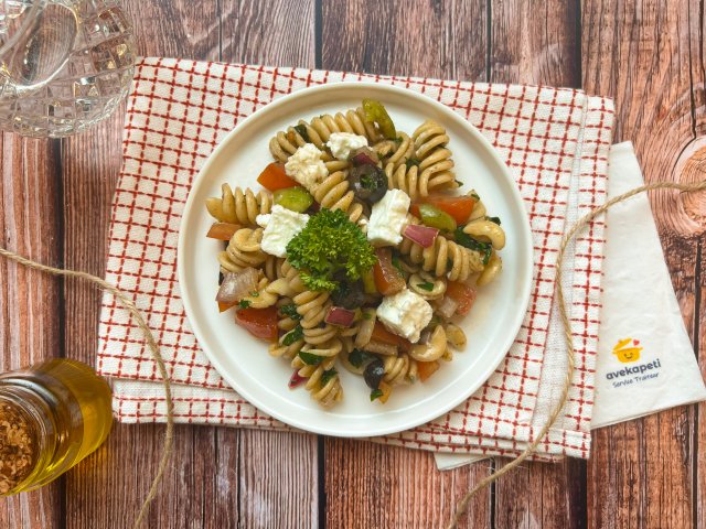 Poulet, fusilli, poivron, tomate, oignon rouge, persil, citron vert, maïs, huile d'olive, paprika, poivre, sel