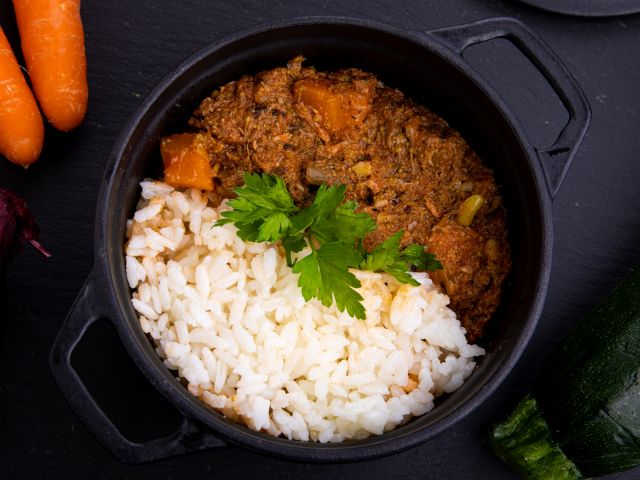 Bœuf, pâte orzo, haricot vert, carotte, oignon, thym, romarin, farine, concentré de tomates, huile de tournesol, huile d'olive, paprika, poivre, sel