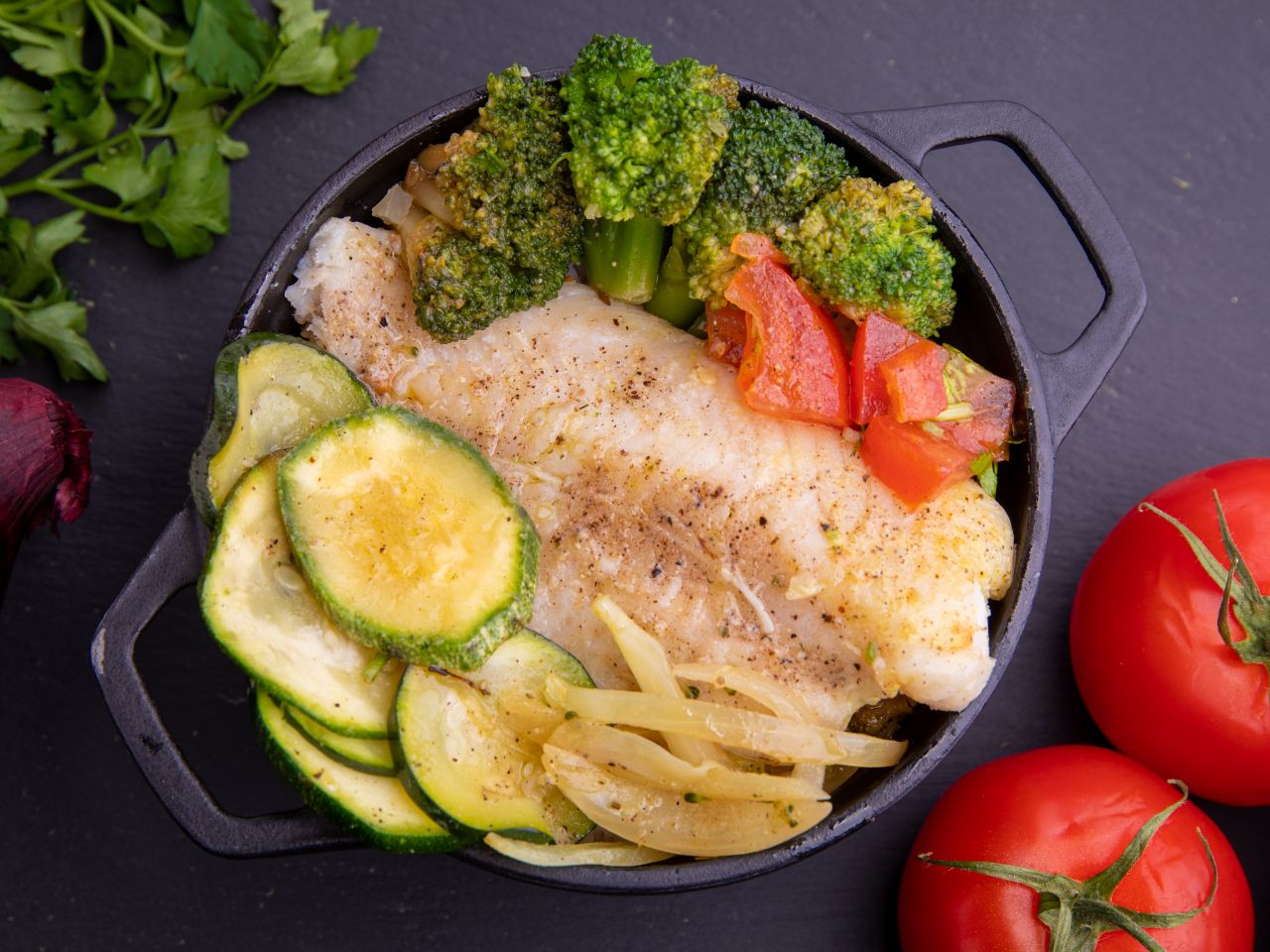 Poisson blanc, riz, courgette, brocoli, tomate, oignon, gingembre, persil, laurier, citron, lait de coco, huile d'olive, poivre, sel, traces possibles d'oeuf et fruits à coque