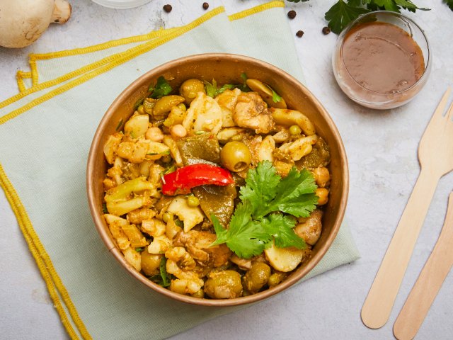 Brocoli, petit pois, haricot plat, fenouil, poivron, tomate, pomme de terre, champignon de Paris, oignon, persil, coriandre, laurier, citron, pois chiche, olive, câpre, huile d'olive, piment jalapeño, poivre, sel, traces possibles d'œuf et fruits à coque